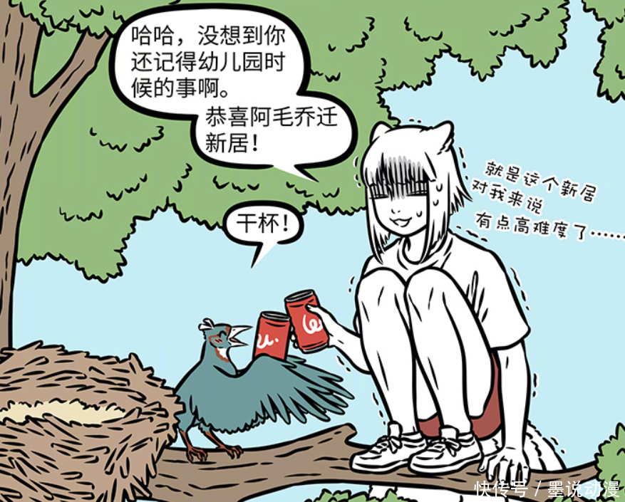 阿毛登场于第1139话,他是精卫的儿子。阿毛出现是因为搬新家,让九月过来一起庆祝。只是阿毛的新家是鸟窝,还在很高的树上。让九月爬上树枝,跟阿毛一起喝饮料,还是有点难为她。不过也是因为如此,九月才会从树上掉下来,还被紫微大帝吸进他的世界里。在那之后,九月开启了八条缘线,见到了小玉、哪吒、孙悟空等人的过去。