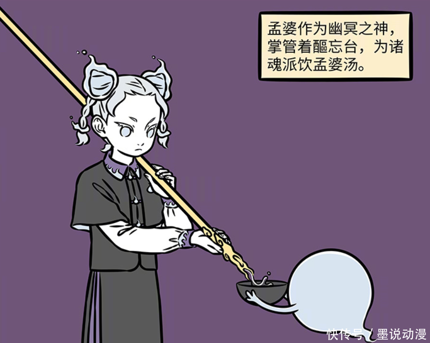 孟婆登场于第1150话,她是幽冥之神,司掌醧忘台。孟婆每天都要让魂魄们喝下孟婆汤,不过随着时代发展,孟婆汤也可以定制,变成魂魄们喜欢的样子。不过别看孟婆看起来可爱,但她也是雷厉风行的神仙,只要有魂魄们不配合,那就会被她揍一顿。孟婆可以说是工作狂,哪怕是白无常谢安带她去游乐园玩,她都会用对待工作的态度去游玩,而且相当专业,且好胜心拉满。