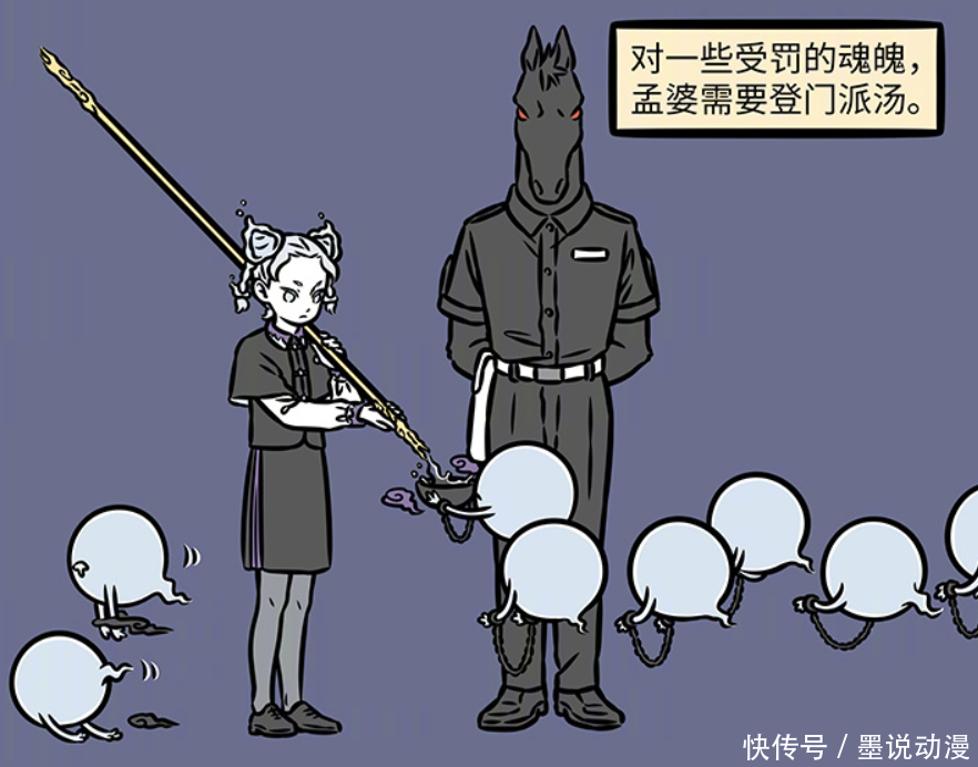 马面也在第1150中出现,一样也是协同孟婆工作。可以看出马面比牛头要严肃一些,毕竟孟婆安排孟婆汤的时候,他就跟在身边。不过看到魂魄们被孟婆处理的时候,马面只是闭上眼睛,他知道孟婆的性格,也知道魂魄们还是听话会比较好。