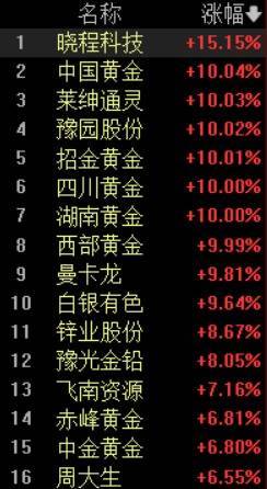 早盘,黄金概念板块持续上涨,晓程科技涨15.15%领涨,板块内中国黄金、莱绅通灵、豫园股份、招金黄金、四川黄金、湖南黄金、西部黄金等7只个股涨停,曼卡龙、白银有色、锌业股份、豫光金铅等涨超8%。